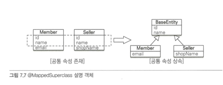 - 매핑하지 않고 자식클래스에게 매핑 정보만 제공하고싶을 때 @MappedSuperclass 사용하여 실제 테이블과 매핑되지 않고 매핑 정보만 상속할 수 있도록