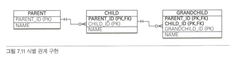 - 부모 테이블의 기본 키를 내려받아서 자식 태이블의 기본 키 + 외래 키로 사용하는 관계 (자식의 기본+외래키로 사용되는 것이 부모의 기본키)