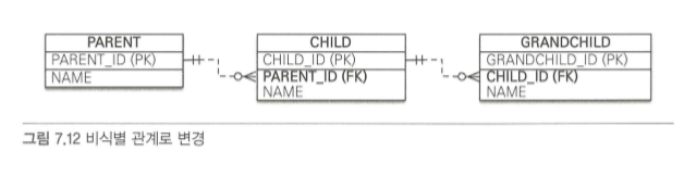 - 식별관계는 자식 테이블의 기본 키 컬럼이 점점 늘어나면서, 조인 시 SQL이 복잡해지고 기본 키 인덱스가 불필요하게 커질 수 있다
