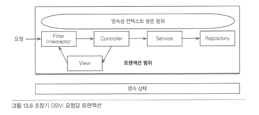 - 요청이 들어올 때 부터 끝날 때 까지 같은 영속성 컨텍스트를 유지 (한 번 조회한 엔티티는 요청이 끝날 때 까지 영속상태 유지)