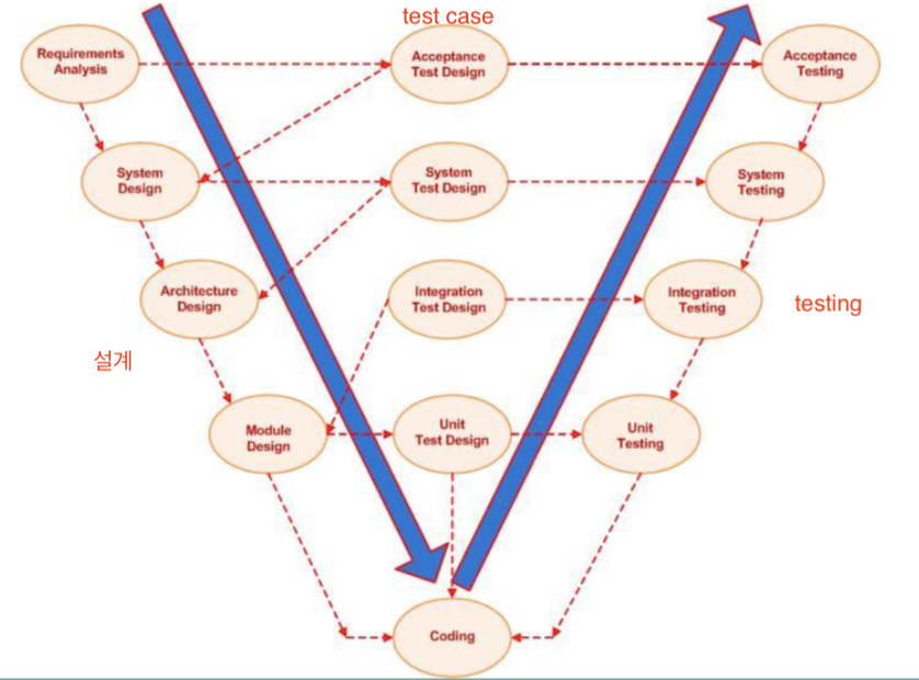 - 개발 cycle의 각 단계와 테스트 단계 간의 관계를 보여준다.