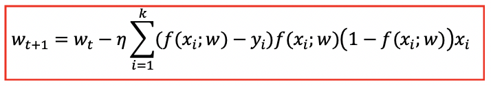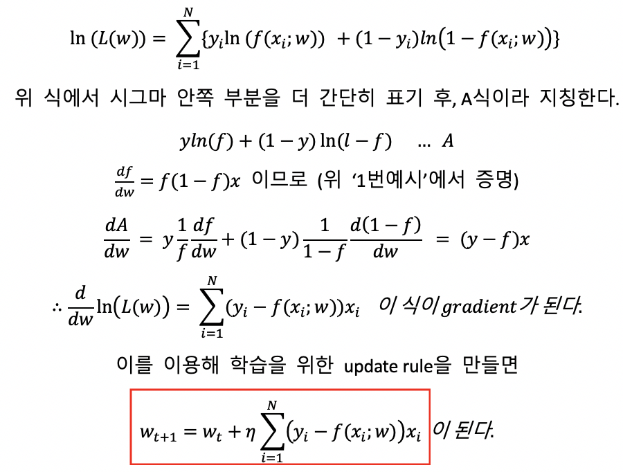 이를 미분해서 w를 구하기엔, 식 자체가 너무 복잡하므로 gradient descent를 이용한 update rule을 사용한다.