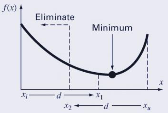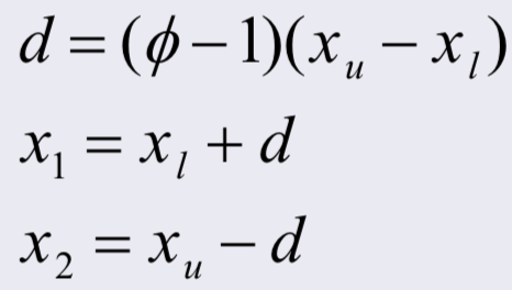 황금비율 중 긴 쪽의 길이를 d로 잡고, xl은 interval의 lower bound, xu 는 interval의 upper bound를 나타낸다. 이 때, x1과 x2는 다음과 같이 잡는다.