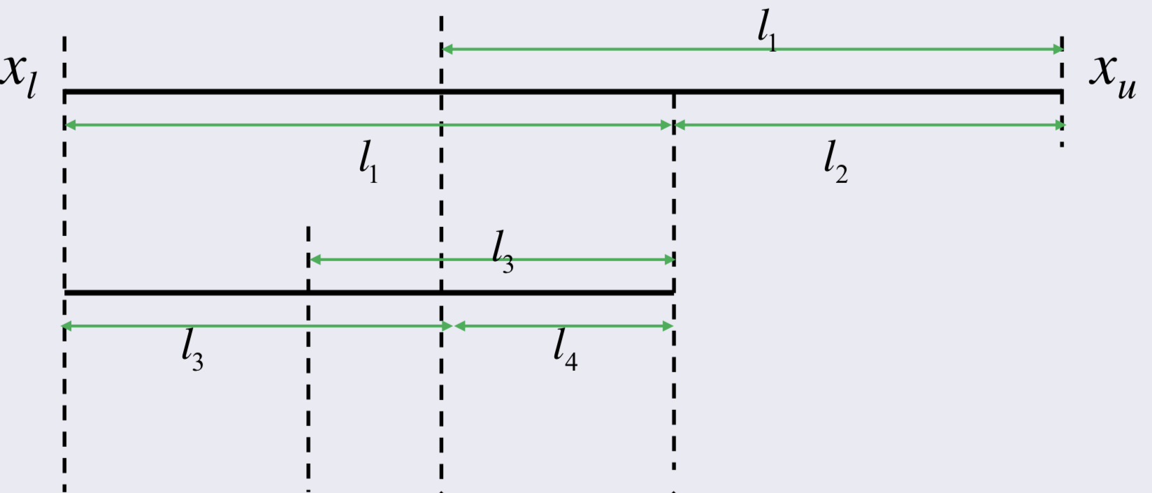 위 그림을 보면, x1부터 l1을 시작할지, xu부터 l1을 시작할지 알 수 없다. Golden-section search는 이를 반복적인 알고리즘을 통해서 정하고, interval을 줄여나간다.