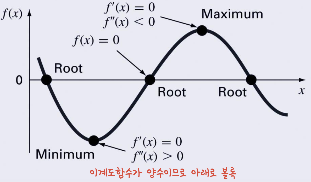 과정은 비슷하지만, f ''(x) (이계도함수)가 사용된다.