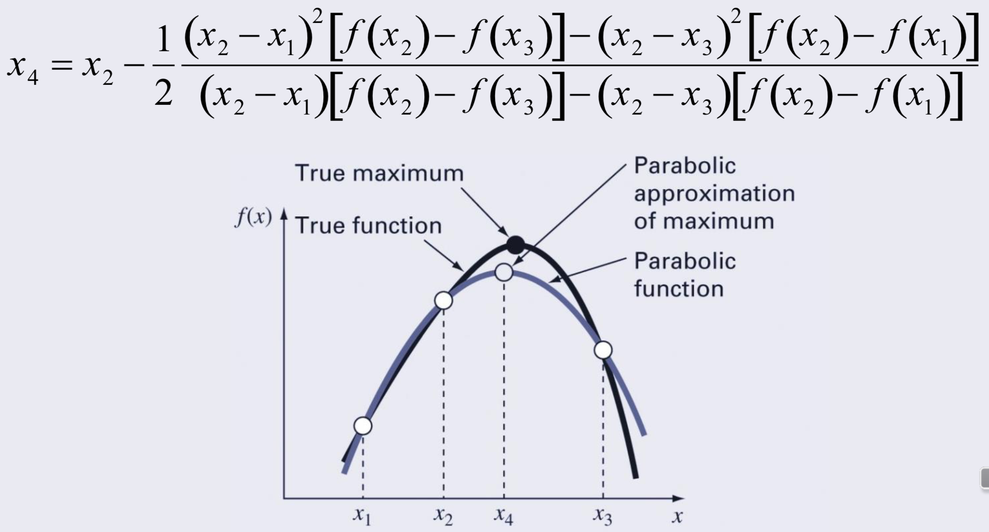 3개의 점을 알고있으면, 그에 해당하는 2차함수를 fitting할 수 있고, 그 2차함수의 min/max값을 갖는 x를 다음 x로 정한다.