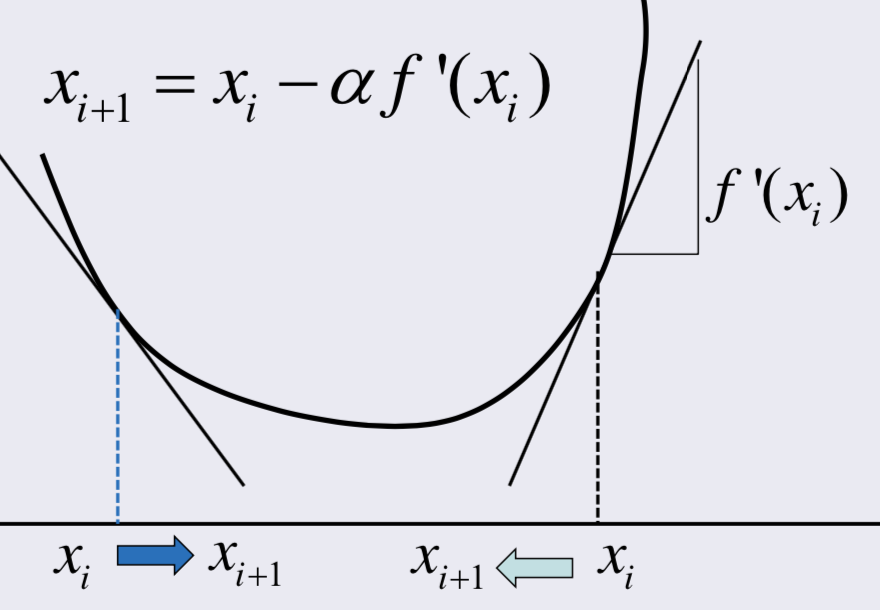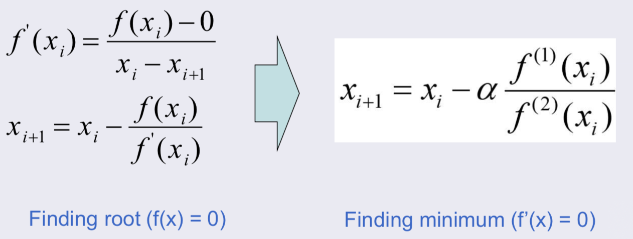 root를 찾을 때 했던 방식을 사용하며, f(x), f'(x) 대신 f'(x), f''(x)를 사용한다.