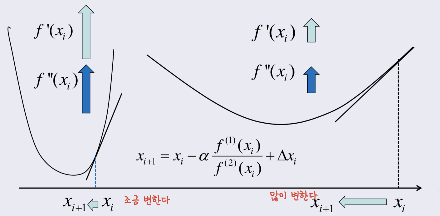 다음 x값이 f'(xi)/f''(xi)에 의해 변동하기 때문에, 미분값들에 영향을 많이 받는다.