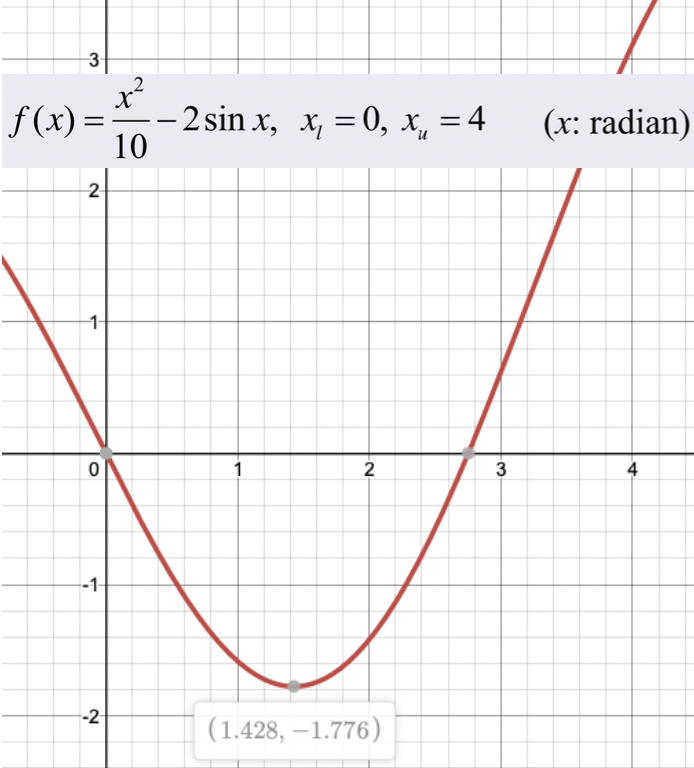 다음과 같은 모양을 가진 식이 주어졌을 때, golden-section search를 이용해 min값을 같게 하는 x를 구하는 과정은 다음과 같다.