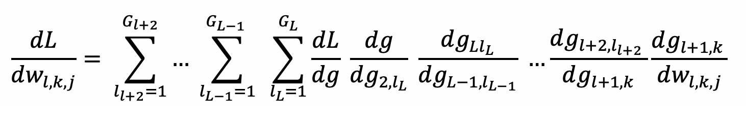 Object function을 loss function으로 두고 l층에서 (l+1)층의 k번째 노드로 가는 j번째 weight(wl,k,j)에 대해 미분을 수행하면