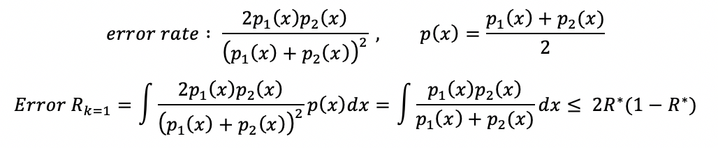 error rate = (x가 class1일 확률) * (x_NN이 class2일 확률)+(x가 class2일 확률) * (x_NN이 class1일 확률) 로 본다면