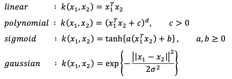 kernel method에 쓰이는 대표적인 kernel함수들은 다음과 같다.