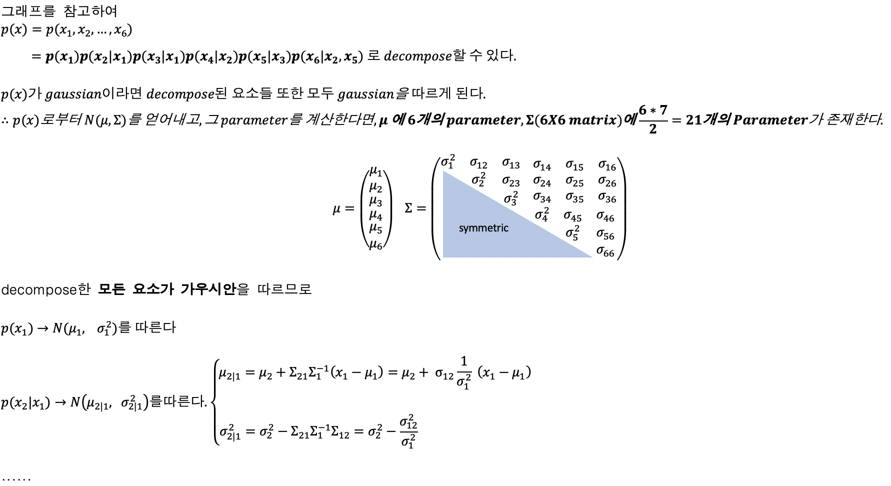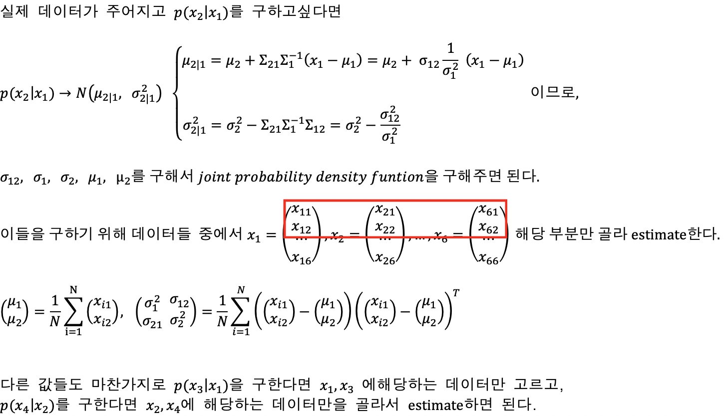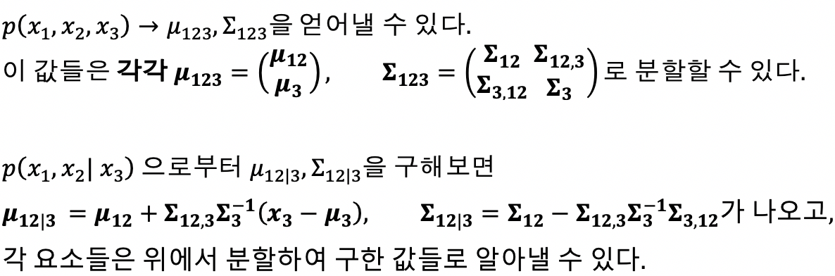 1번 처럼 p(x1,x2 | x3)를 구하는데, 이 joint probability density function이 가우시안이라 가정한다.