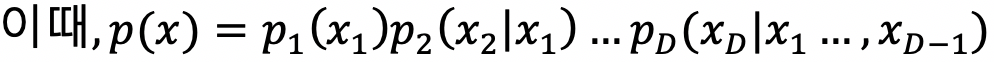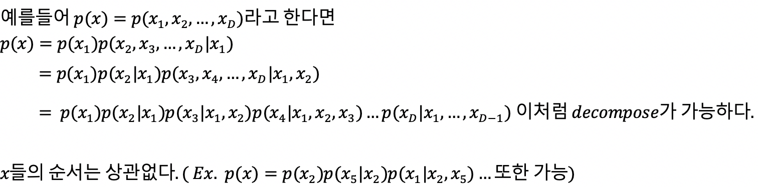 p(x)가 joint density function이라 할 때, chain rule에 의해 다양하게 decompose할 수 있다.