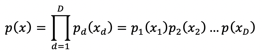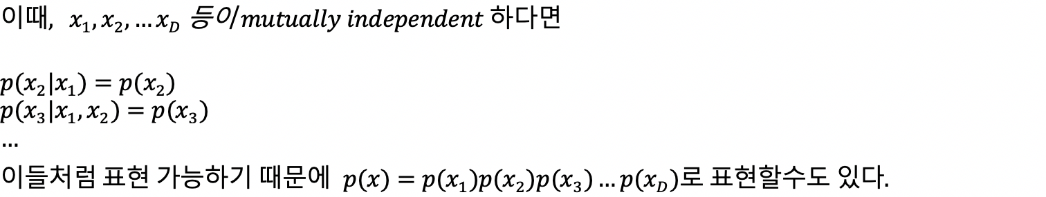 따라서 p2(x2) = p2(x2|x1) 등 모든 항이 같게 되고, 모든 입력변수 x1, x2 ,...xD가 서로 독립적이라는 것을 알 수 있다.