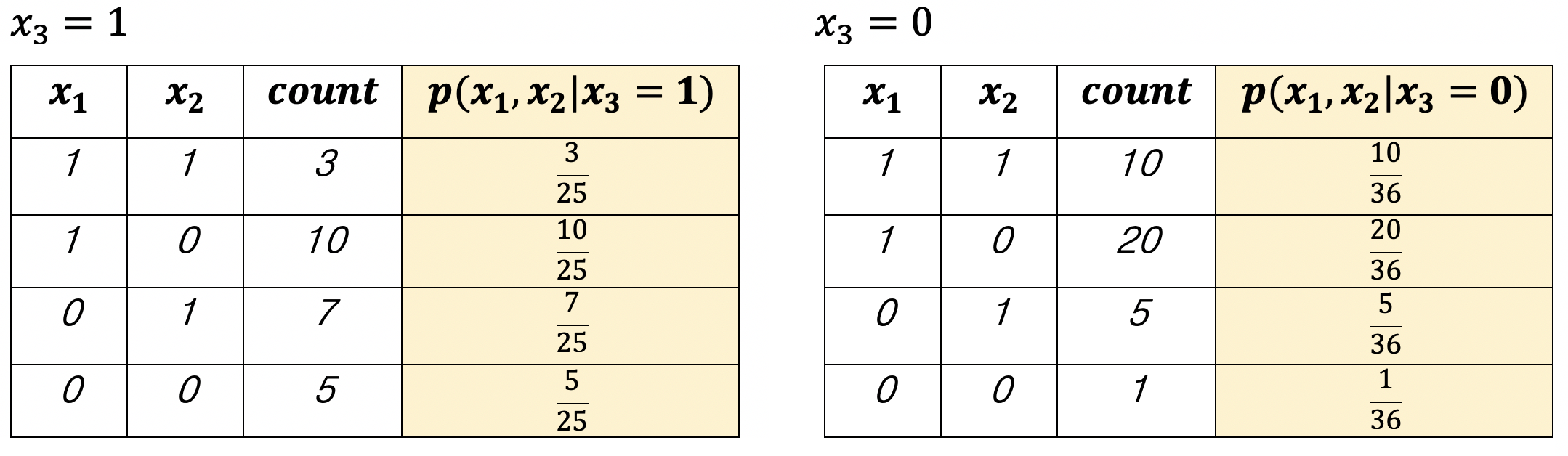 {x1,x2,x3} ∈ {0,1}3 인 데이터가 있고, p(x1,x2 | x3)을 estimation 하고 싶다면