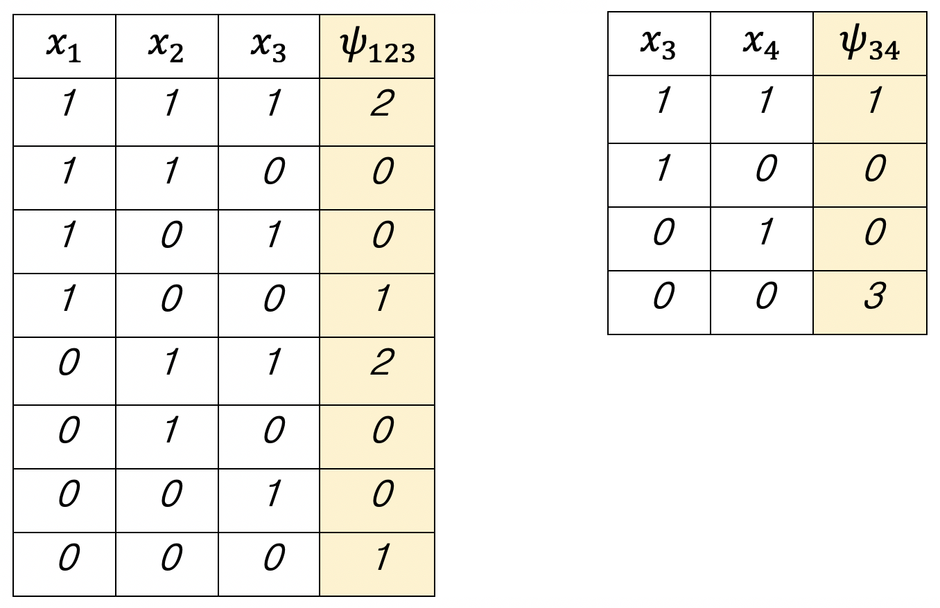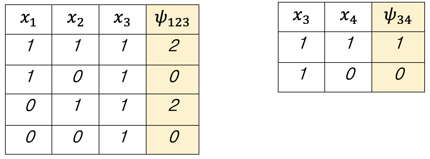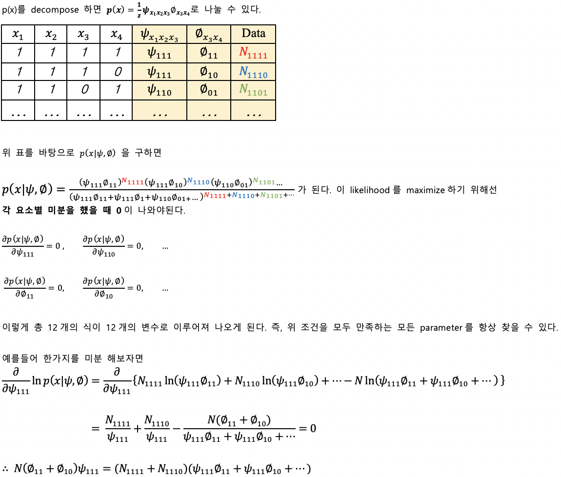 다음과 같은 undirected graphical model이 있고, {x1,x2,x3.x4} ∈ {0,1}4 라고 하자. 이를 바탕으로 표를 그려보면