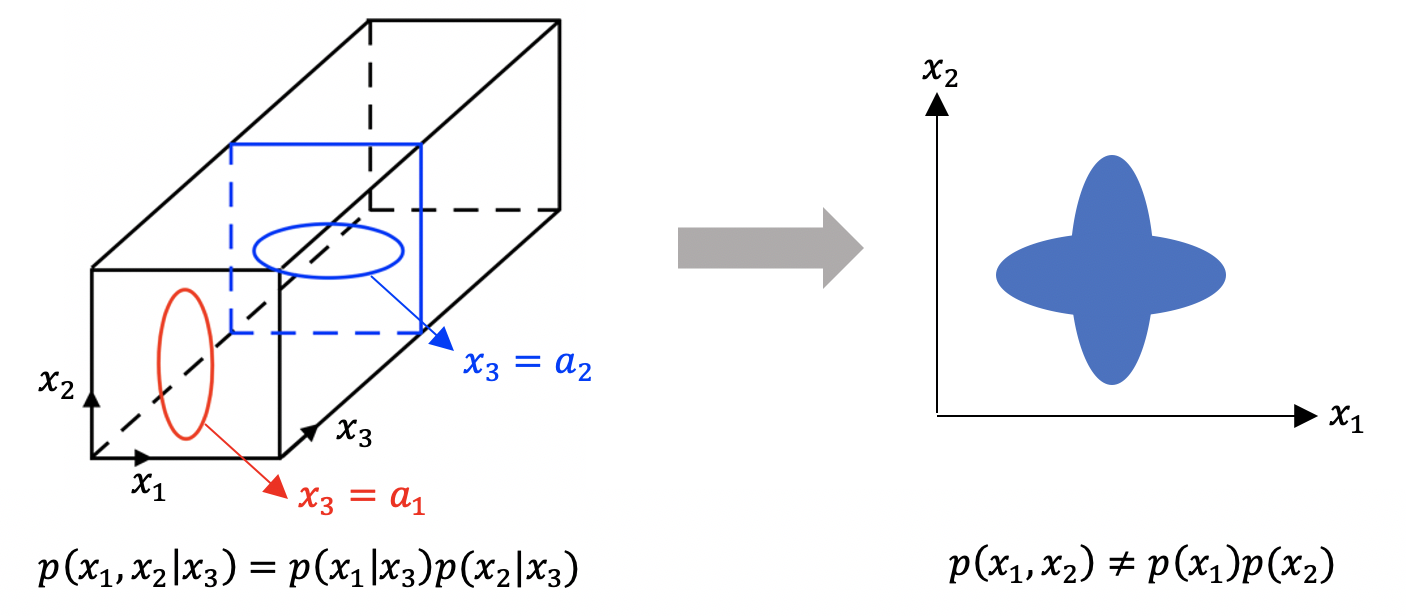 (p(x1, x2|x3) = p(x1|x3)p(x2|x3) 이라고 해서, p(x1,x2)=p(x1)p(x2)가 되는 것이 아니다.)