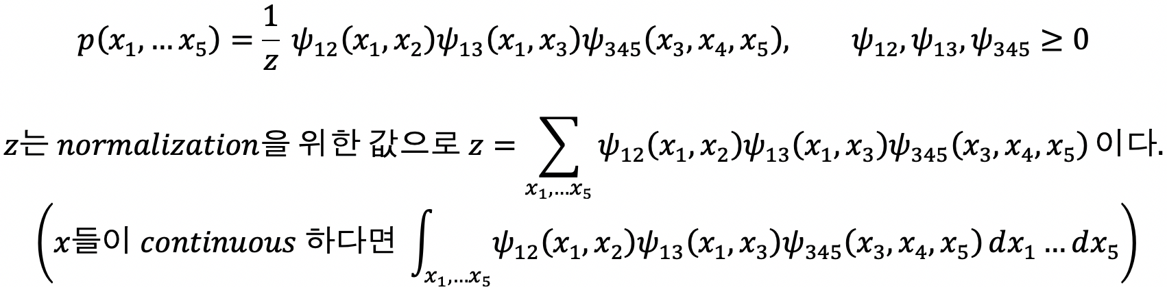 - xi와 xj사이에 edge가 존재하지 않으면, 'ij' edge를 제외한 어떠한 값들이 주어져도 xi와 xj는 독립이다.