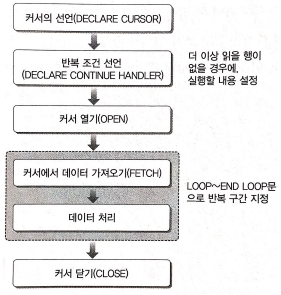 - 테이블에서 여러 개의 행을 쿼리한 후 쿼리의 결과(행의 집합)을 한 행씩 처리하는 방식