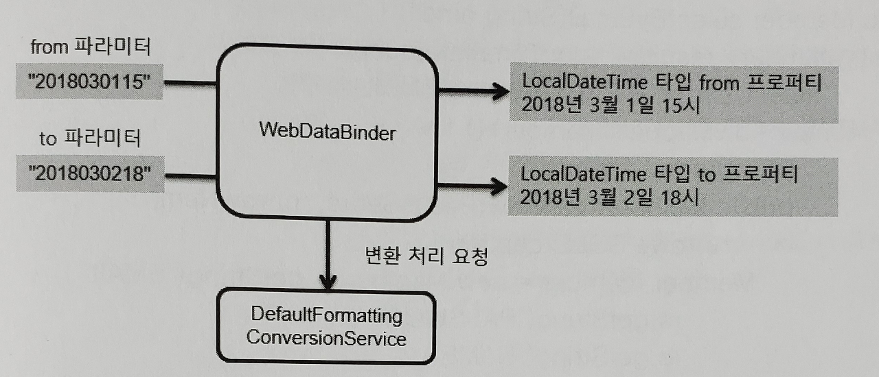WebDataBinder는 ConversionService에 그 역할을 위임하고 DefaultFormattingConversionService가 타입 변환을 실행한다.